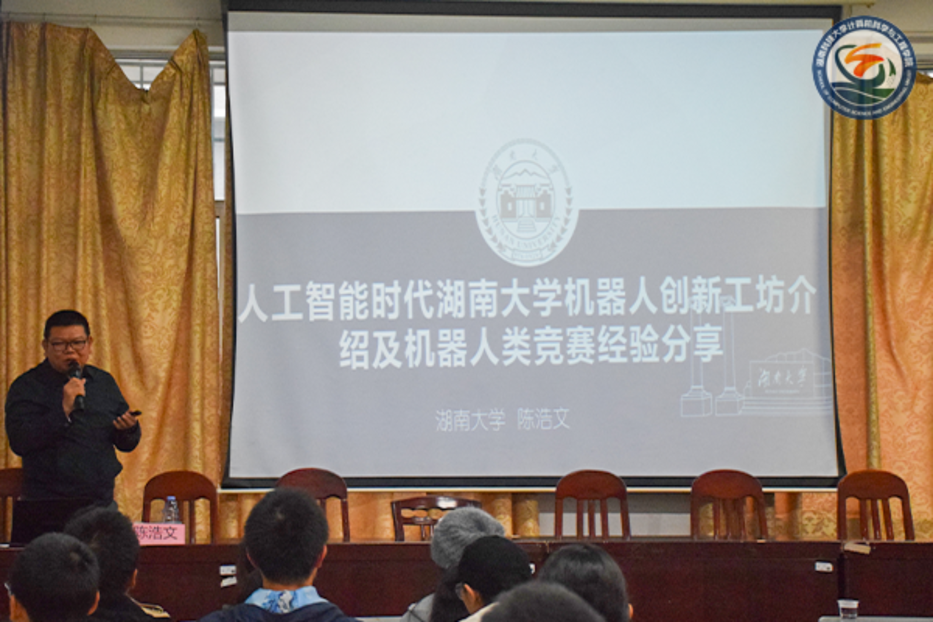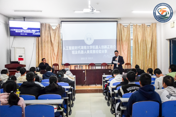10月27日下午,由创业创新学院主办,我院承办的“创新创业大讲堂”第一百二十讲于逸夫楼101会议室举行。湖南大学-天阳金融超算联合创新中心副主任陈浩文主讲《人工智能时代湖南大学机器人创新工坊介绍及机器人类竞赛经验分享》,我院党委副书记王方以及教师代表出席,学生代表与会。