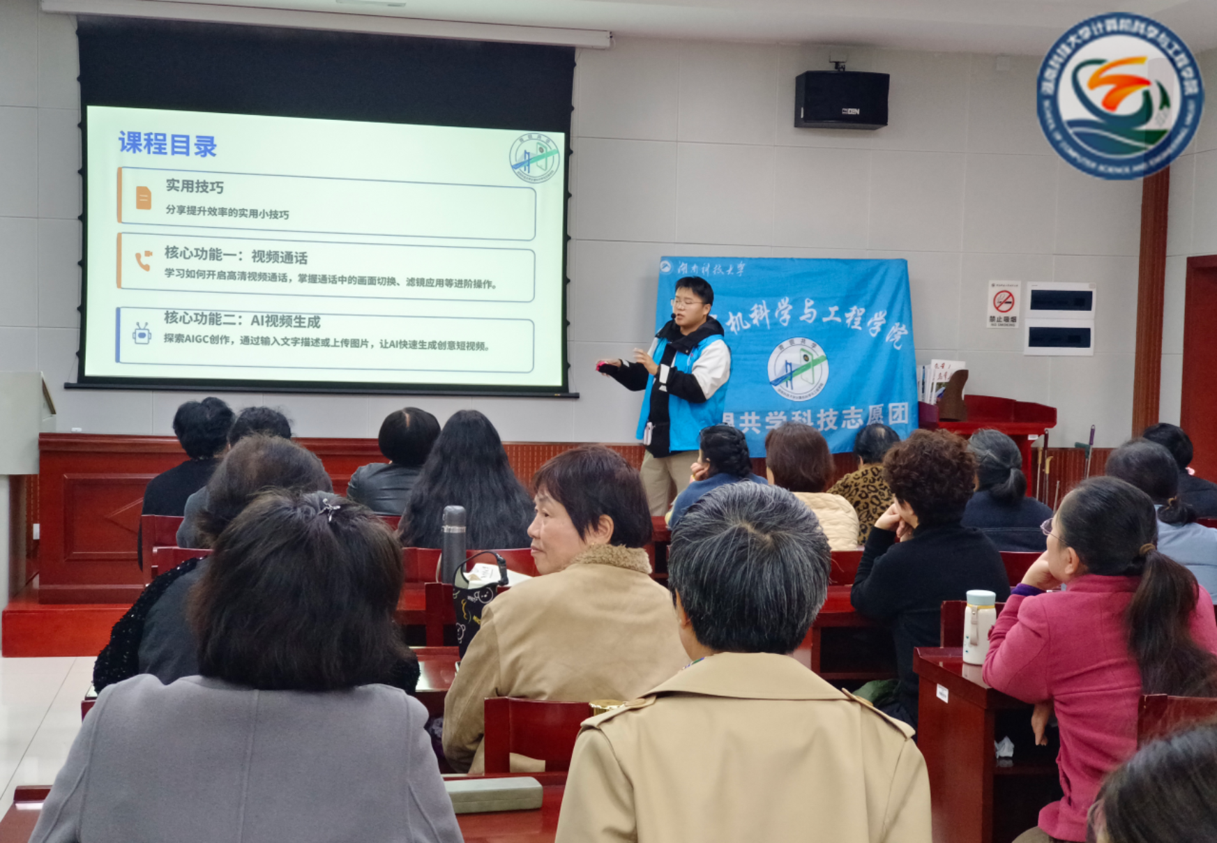 本次课程由元宇宙创新研究院学生党支部党员代表贺俊主讲。他结合老年人日常使用需求,在前期教学基础上,重点讲解豆包字体大小调整、AI视频通话、AI视频生成等实用功能。授课采用分步图示教学法,语言通俗易懂、节奏舒缓清晰,反复演示操作步骤,细致解答各类疑问。
