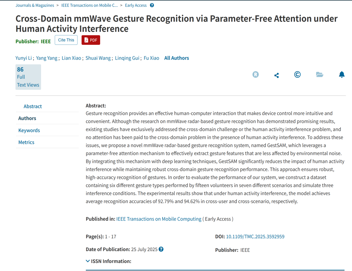 近日,我院李允怡副教授团队在CCF A类期刊《IEEE Transactions on Mobile Computing》上发表题为“Cross-Domain mmWave Gesture Recognition via Parameter-Free Attention under Human Activity Interference”的研究成果。该论文首次将跨域感知与人体活动干扰问题纳入统一的分析框架,提出了一种基于无参数注意力机制的毫米波手势识别方法,显著提升了复杂环境下因用户差异、场景变化及日常活动干扰所导致识别性能下降的鲁棒性。我院为第一完成单位,南京邮电大学肖甫教授为论文的合作通讯作者。
